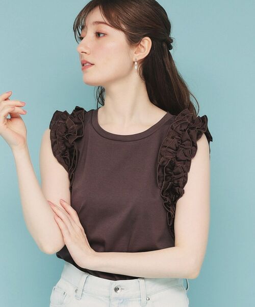 ・華やかなフリルデザインが、女性らしさを引き立てるノースリーブトップス。