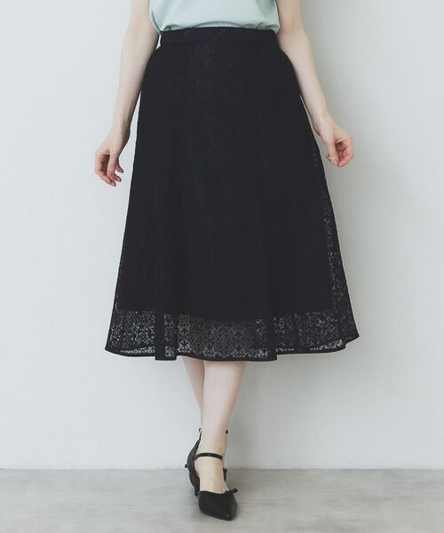 ・繊細なジオメトリックパターンのレースが施されたフレアスカートで、優雅さと洗練さが感じられます。