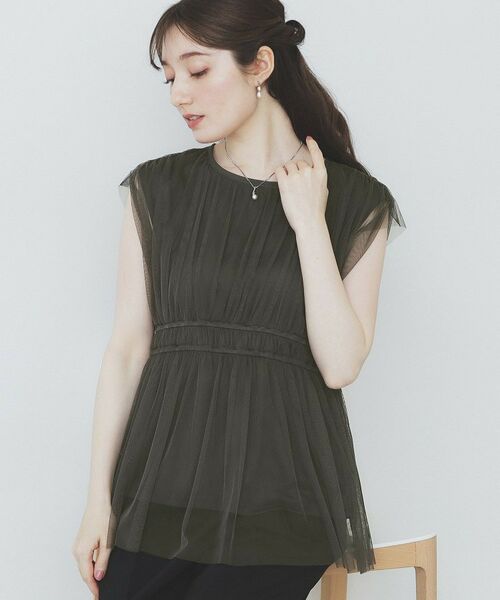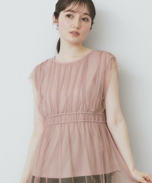 繊細なチュールのシャーリングが効いているペプラムブラウス
