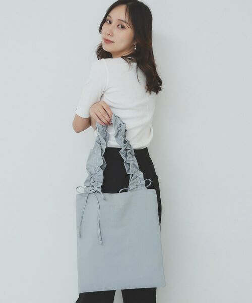 持ち手がフリルになっているポリエステル素材のトートバッグ。