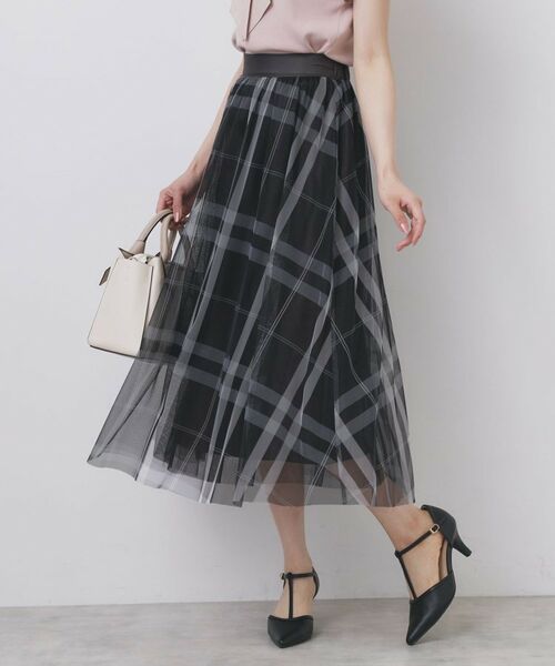 シアーなラメチュールとチェック柄チュールの重なりできらめくフレアスカート