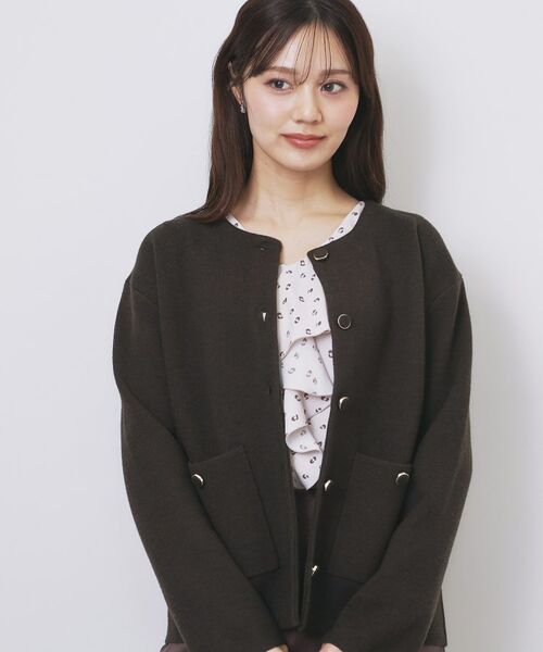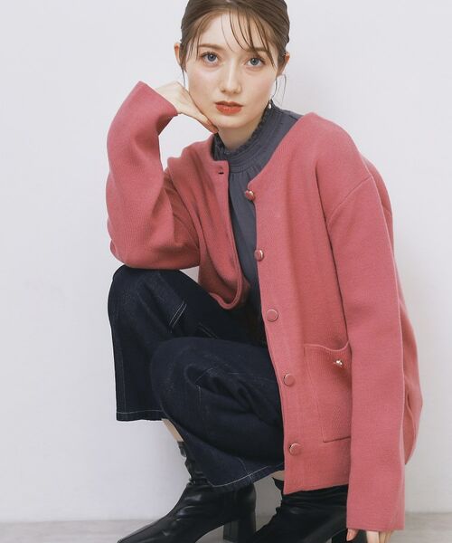 ゴールド縁のくるみボタンが映えるダブルフェイスコーディガン