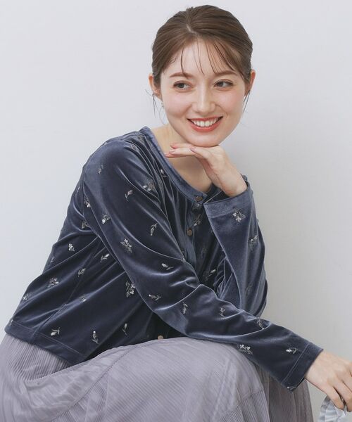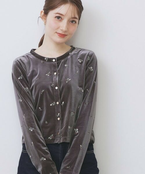 小花刺繍とゴールドボタンが映えるベロアカーディガン