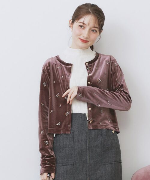 小花刺繍ベロアショートカーディガン【洗濯機OK】