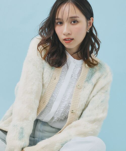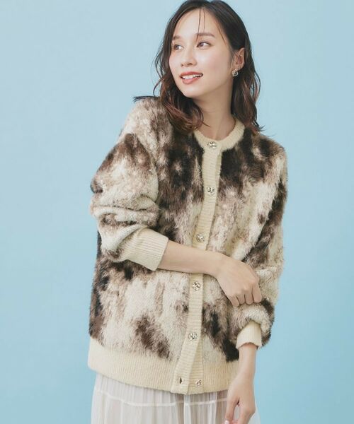 フェザーミックスのぼかし幾何柄がポイントのクルーミドルカーディガン