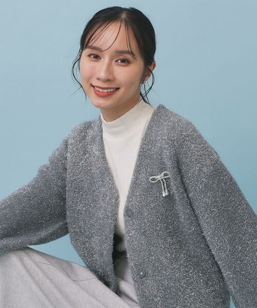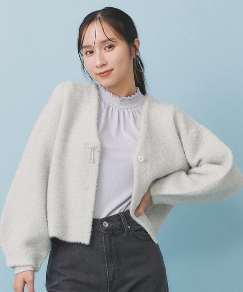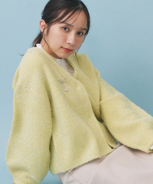 ・フィルムラメが施されたフェザーニットが、光を受けて華やかに輝く、特別な一着。