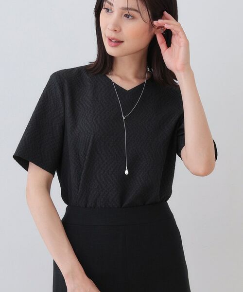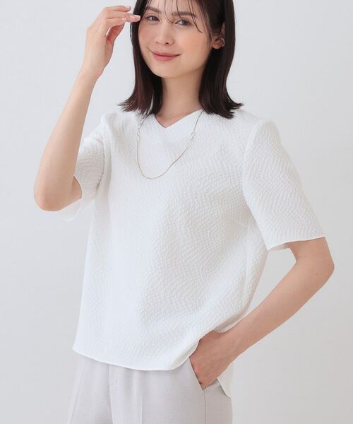 凹凸感のある夏らしいフクレジャカード素材を使用したVネックブラウスです。