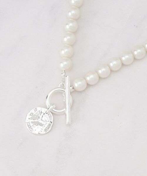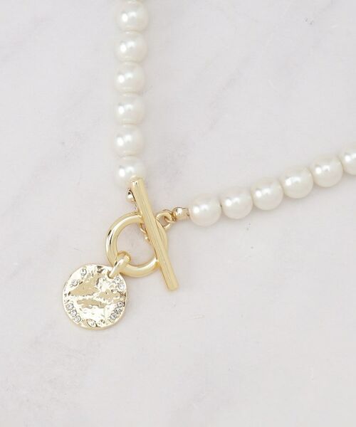 華やかなパール調とトップのニュアンスコインがクラシカルな雰囲気漂うショートネックレスです。