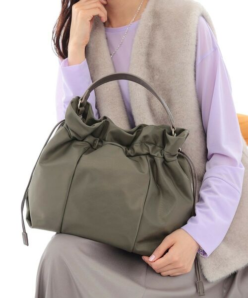 【デザインポイント】光沢で上品さも兼ね備えた軽量バッグです。巾着のようにドロストでシルエットに変化をつけられます。合皮とのコンビで良質感ある見え感に仕上げました。ハンドルは取り外し可能です。【スタイリングポイント】上品さも兼ね備えた見え感でお仕事シーンにも馴染みやすく、デイリー使いまで幅広く活躍します。【仕様】・ポケット数:外側×1 内側×3※照明の関係により、実際よりも色味が違って見える場合があります。また、パソコン・スマートフォンなどの環境により、若干製品と画像のカラーが異なる場合もございます。本商品は、ご注文確定後に取り寄せにてお客様への出荷手配をさせていただきますので、お届けまでに7~10日前後かかる場合がございます。また、商品は他社サイトと在庫を共有しているため、ご注文いただいた商品が欠品となり、キャンセルとなる場合がございます。