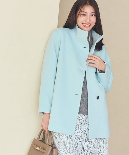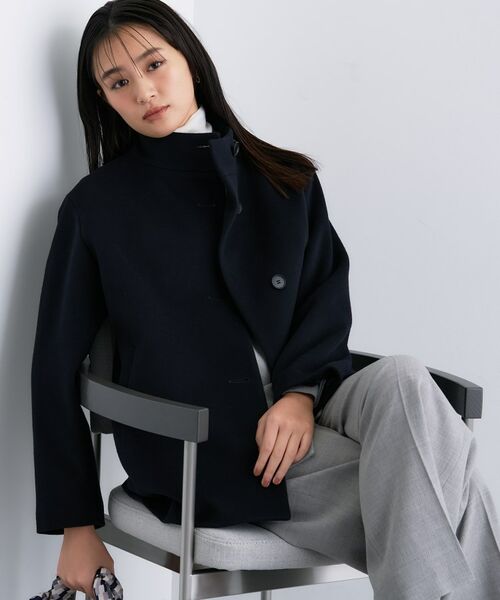 顔回りから少し余裕を持たせたスタンド衿と、釦アクセントがポイントのコートです。