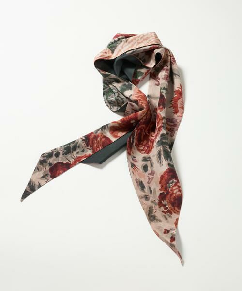 19世紀のフランスの生地をプリントベースにしているスカーフ。シルク単色との組み合わせ、細長い独特の形状が人気のシリーズです。バッグのハンドルに巻いたり、ヘアアクセサリーにしたりといった使い方もおすすめです。