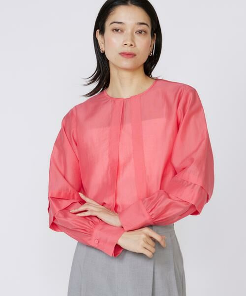 シルクのように上品な光沢感のある軽やかな素材のタックブラウス。襟元のと袖にタックを施し、自然な立体感が引き立つシルエットです。ウエストイン・アウトを選ばずバランスが整う1着。しなやかさの中に適度なハリ感があるため、美しいシルエットを保ちながら、ジャケットやブルゾンのインナーとしてもコーディネートが楽しめます。・バックボタンあり・水洗い可■サンプル撮影商品■こちらの商品はサンプルでの撮影となっております。実際の商品とは、サイズや色味、素材、デザイン等の仕様が若干変更になる場合がございます。