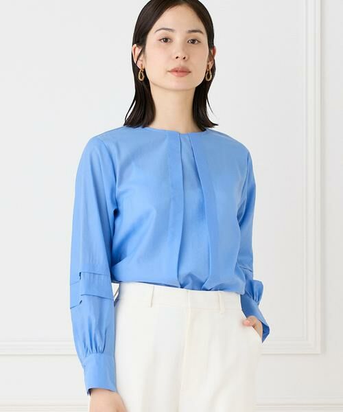 シルクのように上品な光沢感のある軽やかな素材のタックブラウス。襟元のと袖にタックを施し、自然な立体感が引き立つシルエットです。ウエストイン・アウトを選ばずバランスが整う1着。しなやかさの中に適度なハリ感があるため、美しいシルエットを保ちながら、ジャケットやブルゾンのインナーとしてもコーディネートが楽しめます。・水洗い可■サンプル撮影商品■こちらの商品はサンプルでの撮影となっております。実際の商品とは、サイズや色味、素材、デザイン等の仕様が若干変更になる場合がございます。