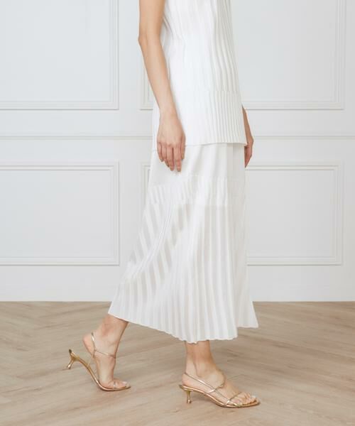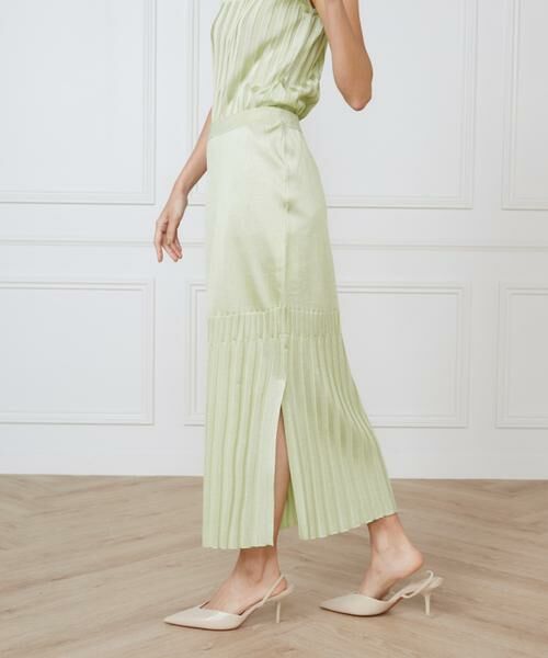 光沢のあるリサイクルポリエステルを使用したニットスカート。イタリアの意匠糸メーカーOLIVO社のオリジナル素材を使用しています。ヘム部分がストライプ柄の編地ですっきりとしたIラインシルエットで、左脇にはスリットを施し、女性らしく抜け感のあるディティールです。同素材のプルオーバーとのコーディネートもおすすめ。モノづくりにおけるクラフトマンシップとプライドを感じる、イタリアの工場cashartで丁寧に編立てました。