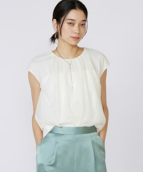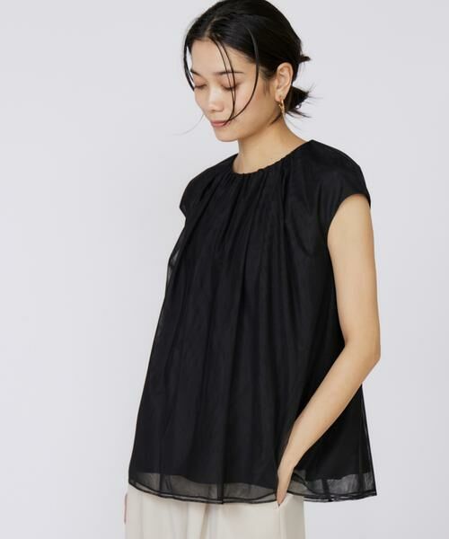 身頃には2枚のチュールを重ねた一点で着映えるブラウス。ギャザーを重ねた襟ぐりはランダムな生地の重なりによってラフな雰囲気をもたらし大人な印象に。素材特性を活かしたことで地味にまとまることなく一目惚れの1着が完成しました。