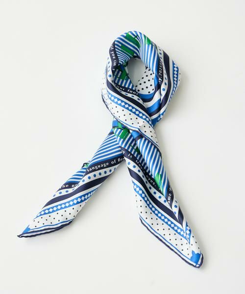 デイジーの様な花の形が印象的なデザイン。背景に爽やかなドットとストライプを入れる事によって白シャツやTシャツなどのカジュアルな夏服にも合わせやすい一枚。縁の辺りにはバンダナの要素を取り入れています。上に描かれている言葉は’Wherever life plants you bloom with grace.’フランスのことわざを英語にし、どこに植えられても優雅に咲き誇れという意味が込められています。