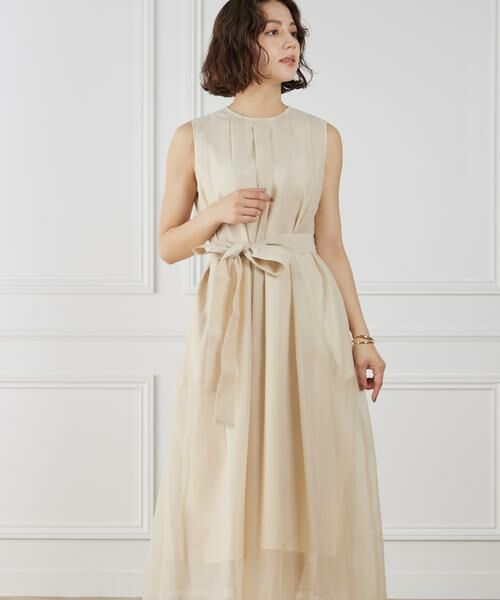 ネックから肩にかけてタックを取りたっぷりとフレアーを入れたシルエットが美しい1着。バランスの取りやすい丈感で、パンプスからサンダルまでさまざまなシューズと相性良く合わせていただけます。エレガントに一枚で着用するのはもちろん、ジャケットなどを合わせたシックなコーディネートもおすすめ。付属のベルトでシルエットを変えられます。合わせる小物次第でさまざまなシーンに幅広くお召いただけます。