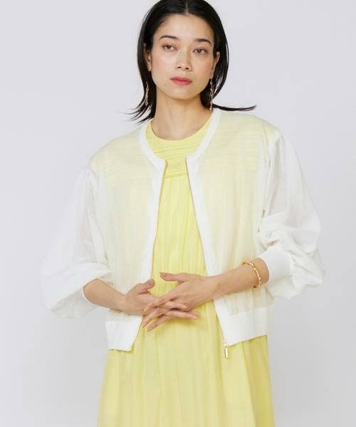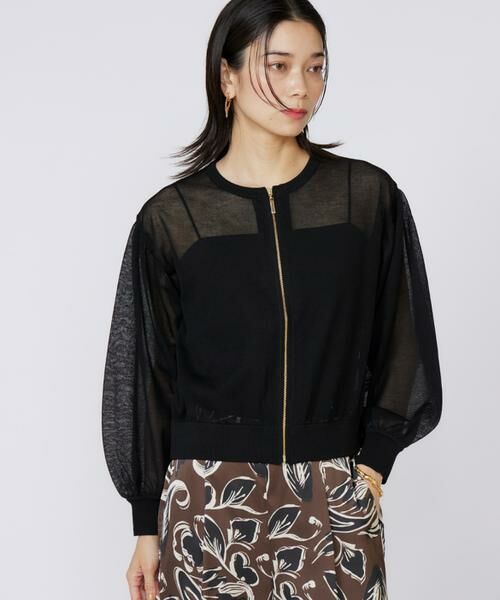 清涼感があり軽やかに仕上げたシアー感のあるジップアップニットカーディガン。ギャザーをふんだんに施したボリュームのあるシルエットがポイント。カーディガンとしてはもちろん、ジップを閉めてプルオーバーとして着るのもお勧め。大人っぽい可愛さ、スポーティ感、シアー感が1枚でも様になる着こなしを演出します。