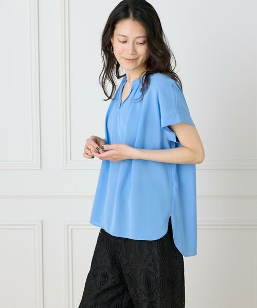 大人のキレイめコーデにはマストのキーネックブラウス。ドライタッチでドレープ性のある素材を使用し、全体にゆとりがありながらもすっきりと着用頂けるサイズ感です。暑い夏にも涼しく着て頂けます。二の腕をカバーするワイドフォルムがトレンド感と気負わない着ごこちを両立。衿のギャザーが顔まわりを華やかに見せてくれます。前後長さの違うヘムラインにサイドスリットでスタイルアップ効果も。