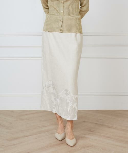 ミモレ丈のタイトスカートは、贅沢にレースをパネル状に刺繍しカットしたものを裾に使用。センターバックの深めのベントで足さばきが良いのもポイント。サイドのメローデザインでラフに仕上げました。