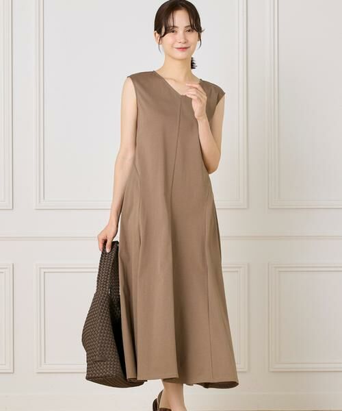 裾にたっぷりと入れたフレアーが上品なノースリーブワンピース。上身頃はスッキリとしたシルエットで腰のあたりからフレアーを入れているのでヒップラインも気になりません。センターに切り替えを入れることでタテのラインを強調しスタイルアップ効果も期待できます。カットソー素材で着心地も良く、光沢感のある素材できれい見えも叶う優秀ワンピースです。