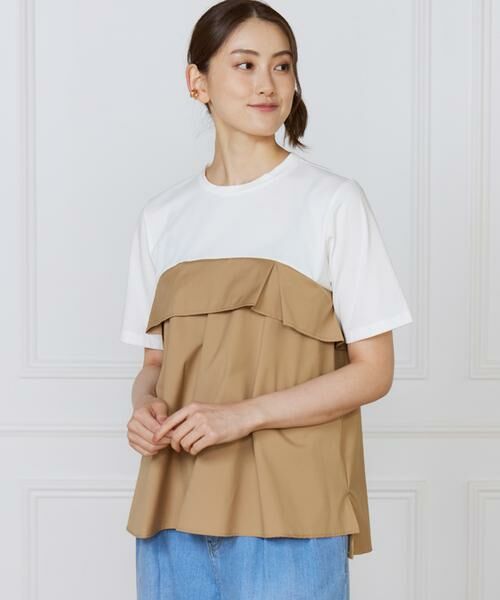 ビスチェをレイヤードして着ているような手軽なデザイントップス。カジュアルになりすぎないようキレイでハリ感のあるカット素材を使用。胸もとから2段にティアードでタックフレアーを出したシルエットなので甘さを抑えて大人っぽく着こなせます。ジャケットやアウターを羽織っても今年らしいスタイリングに。シルエットを楽しめる、表情のある1枚です。