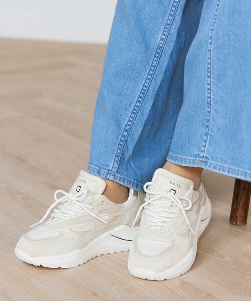 D.A.T.E.(デイト)のアイコンモデルFG。ベージュトーンを基調にした、ナチュラルで上品な印象です。スエードとレザーを組み合わせた異素材デザインが立体感を演出してくれます。ヒール部分にメタリックアクセントをプラスし、さりげない華やかさをプラス。2.5cmのジェルインソールと約5cmの軽量アウトソールで、快適な履き心地とスタイルアップ効果を両立。シンプルながら存在感のあるデザインで、カジュアルからきれいめスタイルまで幅広く対応。シーズンレスで活躍する、洗練された一足です。