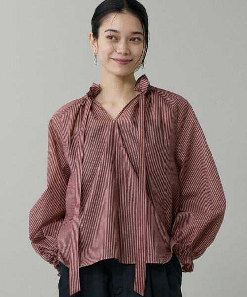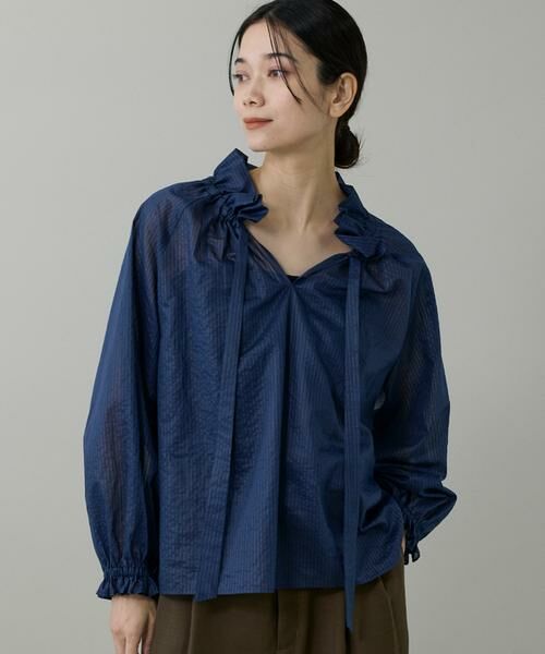 一枚で華やかなボウタイブラウス。首元のリボンが印象的なブラウスです。リボンの出し口部分が縫い留めてあるので、首元を調整せずに、綺麗に着ていただけます。袖口もさりげなくフリルになっており、ジャケットの中に着て、衿と袖口を見せても今年らしくておすすめです。