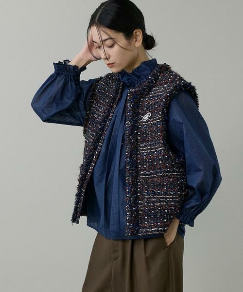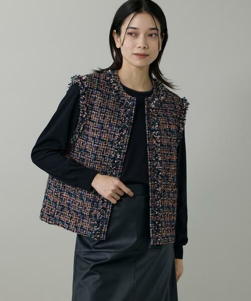 ■デザイン                                                               フィット感のあるコンパクトなバランスが今っぽいジレ。羽織るだけで洗練された着こなしが決まる1着です。手作業で丁寧にほぐした共地のフリンジディテールもこだわりのポイント。随所にあしらわれたフリンジディテールで華やかなアクセントをつけています。カットソーやブラウスなどとのレイヤードスタイルはもちろん、フロントを閉めてブラウス感覚で着こなすのもおすすめです。