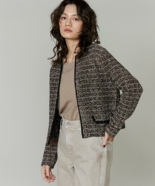 ツイードジャケット風デザインに仕上げたカーディガンは、キラキラと光るスパンコールと様々な糸を使い編み立てられた柄が上品で華やかな印象の1枚です。程良くゆとりのあるシルエットとニットの持つストレッチ性でリラックスして着用でき、秋の端境期に活躍してくれるアイテムです。ニットカーディガンなのでややカジュアルな雰囲気も持ち合わせており、オンオフ問わず幅広いスタイリングでポイントになり、特に綺麗なパンツやワンピースと合わせたミックス感のあるコーディネートがおすすめです。