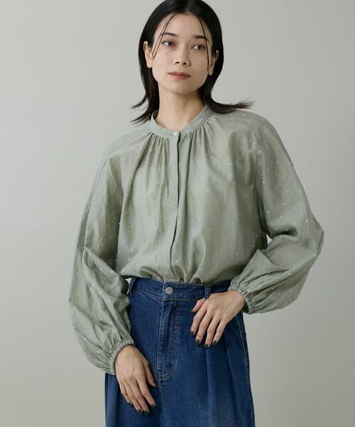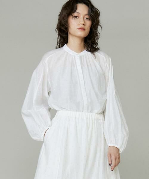 上品で華やかな光沢感を持つラメドットジャカード素材のデザインブラウス。襟元は女性らしくすっきりとしたスキッパー襟にたっぷりとギャザを入れた立体感あるフォルム。ラグランスリーブでふんわりとしたパフスリーブがポイントです。綺麗め、またはカジュアルスタイリングにも合わせやすいブラウスです。