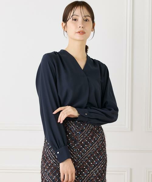 ■デザイン肩にギャザーを寄せたセットインスリーブのブラウス。ジャケットのインナーにすっきりと辛口の印象で着られ、1枚で着用しても華やかな印象になります。女性らしいVネックとワイドカフスが特徴です。■素材トリアセテート、ストレッチ糸、コットンを用いたサテン素材です。トリアセテートのエレガントな光沢感を残しつつ、コットンのカジュアル感、ハリ感を共存させたハイブリット素材です。コットン混の生地に出がちな凹凸感を消すためにフラット加工を施しております。・水洗い可■サンプル撮影商品画像の商品はサンプルです。実際の商品とはサイズや色味、素材、デザイン等の仕様が若干変更になる場合がございます。■カラーについては、可能な限り実際の商品に近いカラーで撮影をおこなっておりますが、照明の関係により実際の製品とは色味が違って見える場合があります。またパソコン・スマートフォンなどの環境により、若干製品と画像のカラーが異なる場合もございます。現物と画像のカラー差異については返品理由となりませんので、予めご了承ください。■サイズ表記はあくまで目安となります。