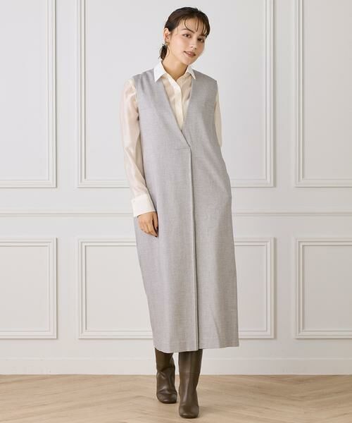 上質なツヤ感が特徴のウールを使用したレイヤードワンピース。フロントの深くカットしたVネックラインが抜け感を演出してくれます。バックスタイルは太めのベルトデザインで前後のデザイン性のコントラストもポイント。深めのタックを入れたコクーンシルエットで様々なレイヤードスタイルを楽しめる一着です。メルト部分に使用した金属パーツも拘りポイントです。