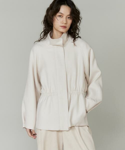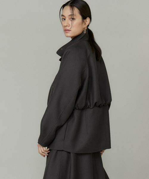 スポーティーなデザインながらスタンドカラーでカジュアルになり過ぎず、シャープな着こなしが決まります。横から見た時の立体的な袖のフォルム、全体的に細身のシルエットに作られているので、後ろのフォルムがより際立つ、デザイン性の高いブルゾンです。メタルのゴールドボタンや前立てのフラップもデザインポイント。ウエストに施したドローストリングの調整で着こなしに合わせてシルエットをアレンジしていただけます袖口は二段階でアジャストでき、手首できゅっと絞るとまた違った雰囲気でお召しいただけます。