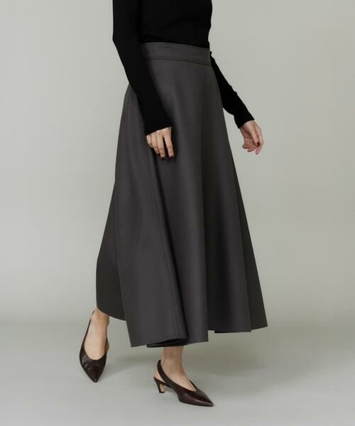 リバー生地で仕立てたロング丈スカート。控えめなAラインシルエットにスリットを設け、上品ながらも軽やかなヌケのある印象の1着に。同素材のブルゾンやジレとのセットアップでの着こなしもおすすめです。