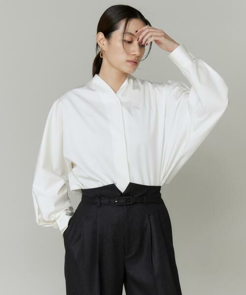 ふんわりとしたシルエットで仕立てられたモダンなブラウス。クラシックなネックとドルマンスリーブが特徴。袖口部分のダブルタックがさりげないボリューム感のある丸みを生み出しています。襟部分とウエスト部分にのみ表面に見えるボタンデザインもポイントです。