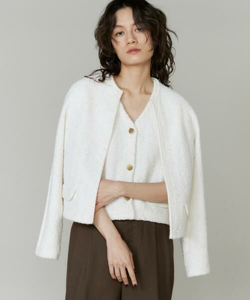 ツイードジャケット風デザインに仕上げたカーディガンは、キラキラと光るスパンコールと様々な糸を使い編み立てられた柄が上品で華やかな印象の1枚です。程良くゆとりのあるシルエットとニットの持つストレッチ性でリラックスして着用でき、秋の端境期に活躍してくれるアイテムです。ニットカーディガンなのでややカジュアルな雰囲気も持ち合わせており、オンオフ問わず幅広いスタイリングでポイントになり、特に綺麗なパンツやワンピースと合わせたミックス感のあるコーディネートがおすすめです。