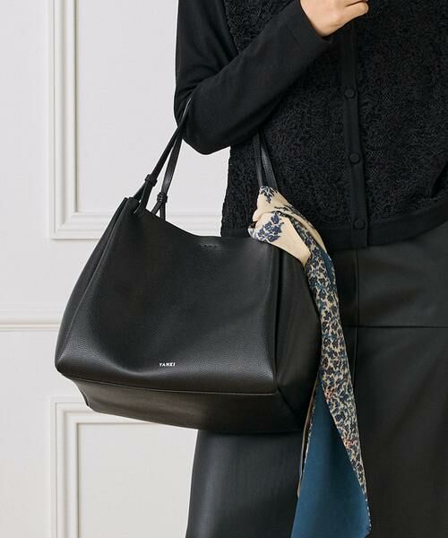 SOFT SHRINK レザーのトートバッグ。たっぷりとした容量と独特のフォルムで存在感を放つ、ビッグサイズトートです。ボディにはシボ感のある床革を使用し、軽やかなのにしっかりとした素材感で日常使いにもぴったり。大胆に取ったマチ幅が、見た目以上の収納力を発揮。書類や500mlボトル、ポーチなどを余裕で収納でき、オンオフ問わず活躍します。華奢なストラップを結びつけたようなハンドルデザインがミニマルな印象にアクセントを加え、さりげなくモードな雰囲気を演出。肩に掛けたときのフィット感もよく、スタイリングにすっと馴染みます。 シンプルながらも構築的なシルエットで、気負わずモダンなスタイルを楽しめる一品です。