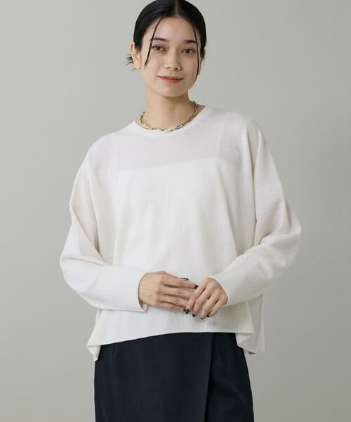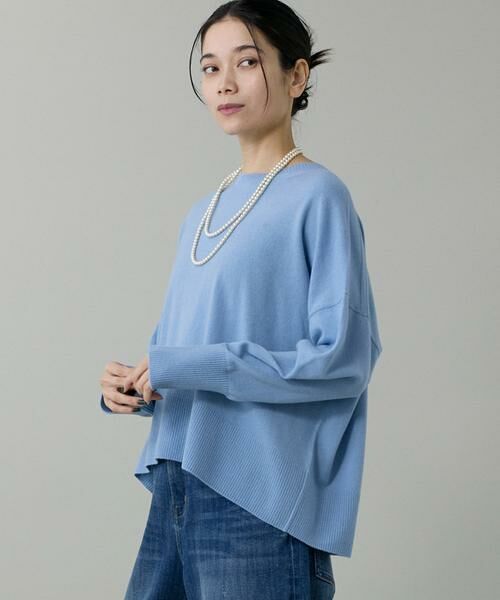 ゆったりとしたワイドなサイジングで動きのある抜け感を演出できる大人ニット。デザインはベーシックですが、詰まり気味の衿ぐりや肩線にガーター編みを入れる等の細かいディテールにこだわり、リラックス感と上品なニュアンスのある表情に仕上げています。フロントがやや短めのカーブ形状の裾のラインはサイドから見てもバランスが良く、秋冬の幅広いスタイリングで活躍してくれる上質なアイテムです。
