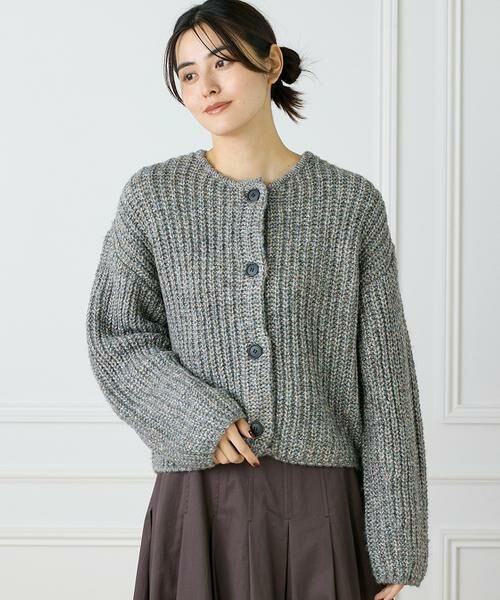ざっくりと編まれたショート丈のカーディガン。素材の持つ華やかなグリッター感と、ボリューミーなシルエットがポイントで軽く羽織るだけで華やかな印象に。端境期のコーディネートのアクセントになる主役級の1枚です。