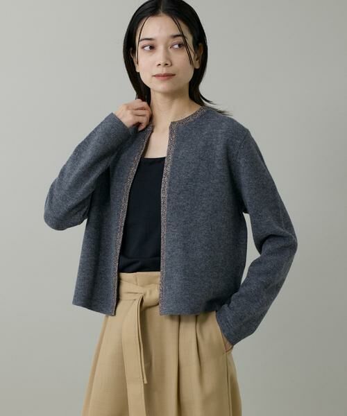 コンパクトなボクシーなシルエットと詰まり気味のネックラインでクリーンなバランスの1着。衿と前立てにラメ糸を使用することで、顔まわりを華やかな印象に。着回しもきく上品なアクセントになってくれます。フロントはスプリングホックの一転留めでモダンなバランスに。ライトなジャケット感覚で着用でき、オンオフ問わず幅広いシーンで活躍してくれるアイテムです。