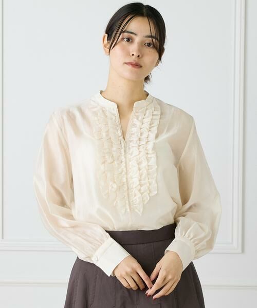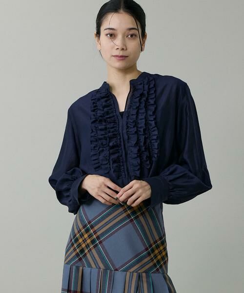 前身に施したデコラティブなタックフリルが印象的なブラウスです。フロントはスキッパー開きで、胸元が華やかなスタイリングが楽しめます。バックネックにタックを入れたややフレアなシルエットで、1枚でのスタイリングも様になります。表情のある透け感のある素材を使用することにより抜け感がプラスされます。