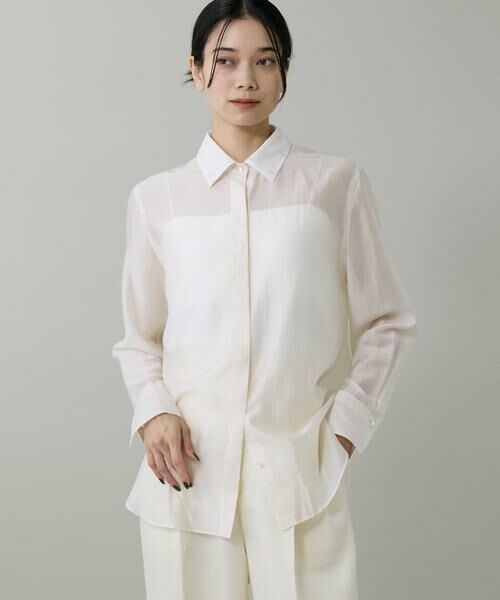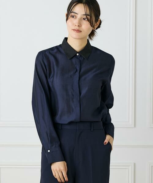 ラメ糸の入ったラメドット素材の襟がポイントの上品な光沢と透け感が魅力のシャツです。ボディは無駄のないミニマルなシルエットで、ジャケットインやニットとレイヤードするなど、襟を見せてコーディネートのポイントにする着こなしがおすすめです。