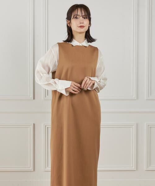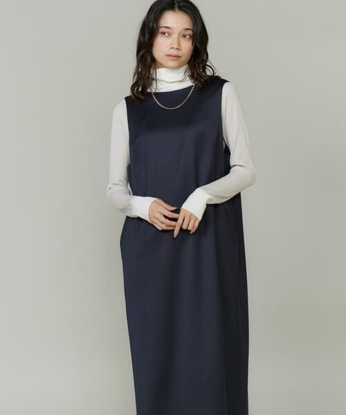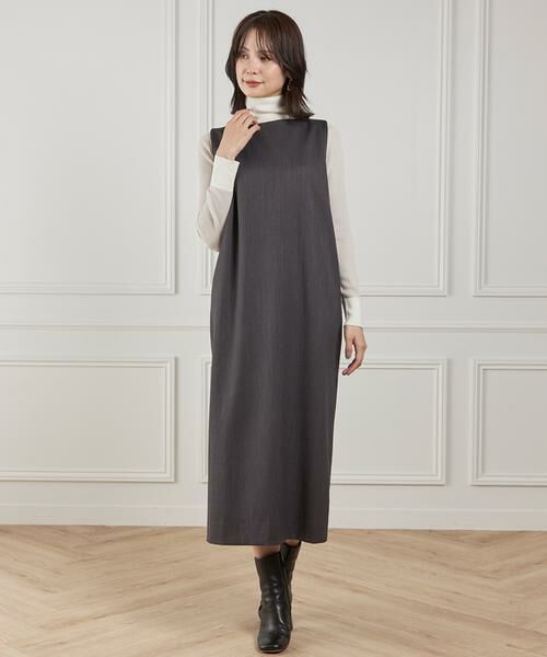 身頃まわりにほど良いゆとりを持たせ、ストレートシルエットですっきりした印象の一着。前の襟ぐりは緩やかなボートネック、後ろ襟ぐりにかけてVネックのカッティングのバックシャンなデザインに仕上げています。バックに入れたスリットで足さばきも良く実用的。一枚でフォーマルなシーンにはもちろん、ハイネックニットやブラウスなどさまざまなトップスとのレイヤードをお楽しみいただけます。