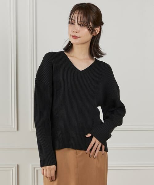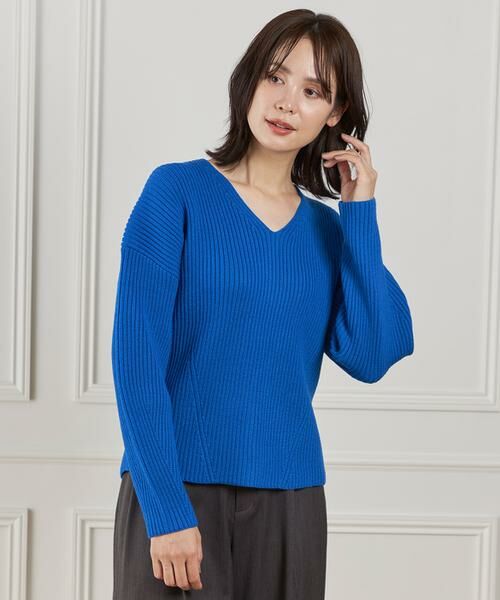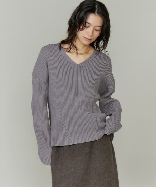 デコルテを美しく見せてくれるVネックのシンプルなプルオーバー。裾にカーブで前後差をつけており、ゆったりとしたサイズ感なので全体的に抜け感があり女性らしい印象に。ざっくりと編まれてた縦方向の柄と前身頃に入れた柄によりスッキリと見せる目線効果も。