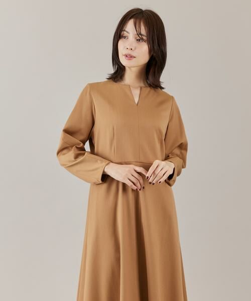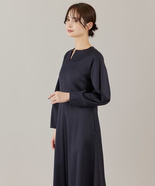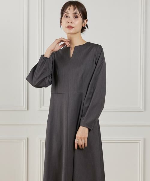 ■デザイン ウエストの切り替えやフィット感のあるトップスに分量感のあるフレアスカートで女性らしいメリハリのあるバランスに仕上げました。キーネックデザインでほど良いシャープさをプラスしています。小さく膨らむパフスリーブデザインでほど良くフェミニンさをプラスしています。バランスの取りやすい着丈でパンプスからブーツまでさまざまなシューズと好相性。日常使いはもちろん、お食事会やオケージョンシーンにも活躍してくれる汎用性の高いアイテムです。
