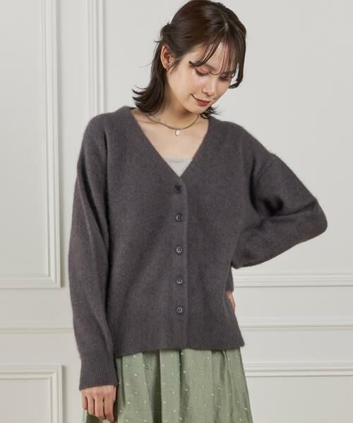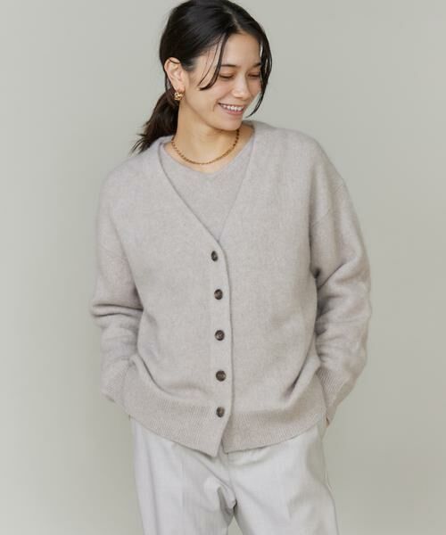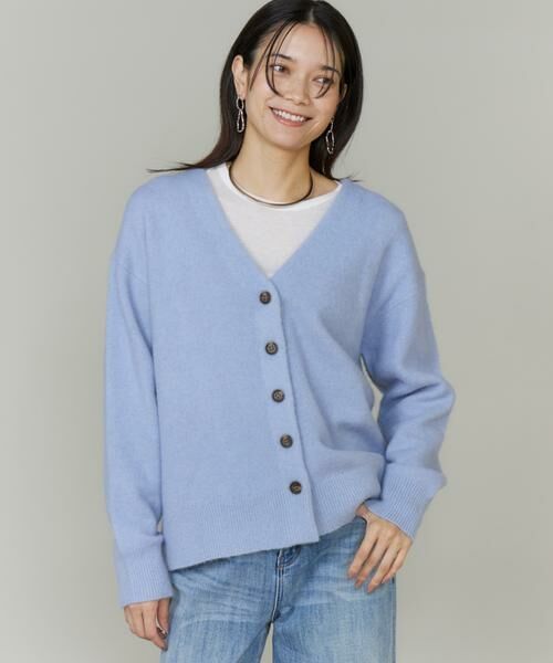 柔らかい毛足がポイントで一枚でもコーディネートのアクセントになるVネックカーディガン。ゆったりとしたサイズ感と、ほどよいVネックの開きが抜け感を演出してくれます。上質な素材感を際立たせる為、前立て部分を見返し使いにして出来るだけシンプルなデザインにしました。袖口はリブ使いにしているので、袖を捲し上げてもしっかりホールドできます。サラッと羽織れるので、メインアイテムとしてコーディネートを楽しんでいただけるアイテムです。