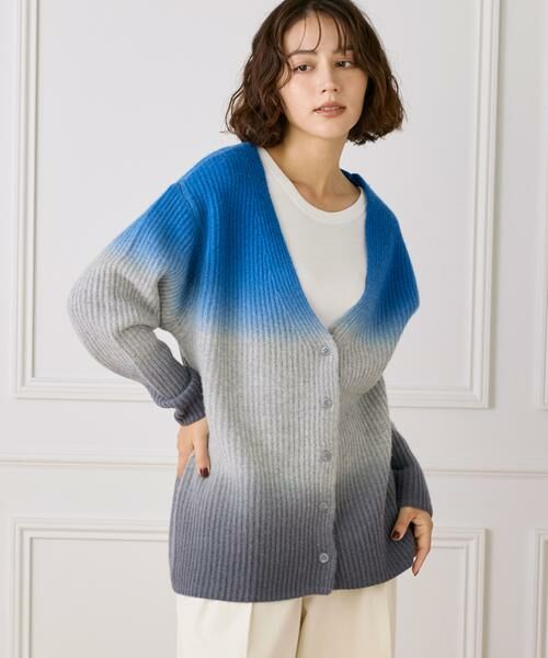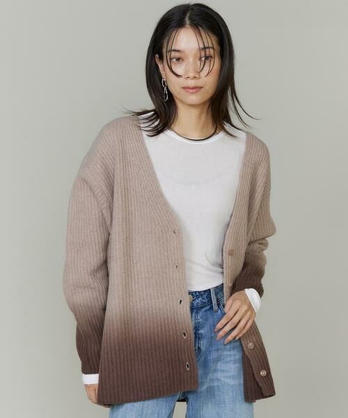特殊な染色技術によって美しいグラデーションが表現されているので一枚で華やかさがあるカーディガンです。リブ編の凹凸感がグラデーションの色合いに奥行と立体感を生み出してくれるので表情豊かなカーディガン。Vネックなので顔周りをシャープな印象に見せてくれます。インナーにタートルネックやシャツなどを合わせたレイヤードスタイルを楽しめる一着です。