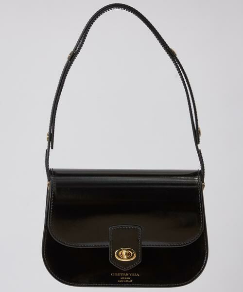 光沢感のあるガラスレザーを使用したショルダーバッグ。ゴールドのパーツ、ブランドロゴがラグジュアリーな雰囲気を演出します。バッグの内側は上品な印象のスエード加工。ショルダ-部分はドットボタン式で、長さの調整が可能です。