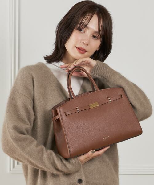 上質なシボ感のあるレザー素材の風合いと、洗練された上品デザインが魅力的。収納力に優れたマチ付きのスクエアフォルムや、取り外し可能なショルダーストラップ仕様、底鋲のあしらいなど、実用性の高さも嬉しいポイントのハンドバッグです。